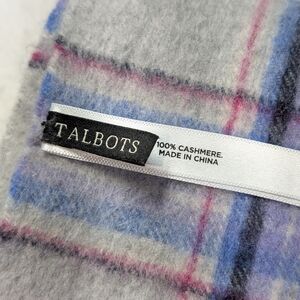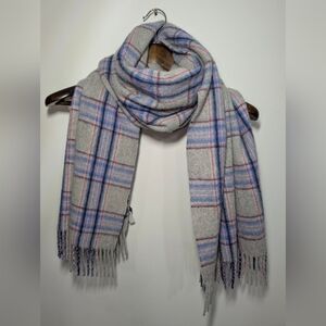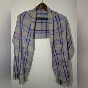 Luxurious ultra soft 100% cashmere scarf by Talbots featuring a classic plaid design in shades of gray, blue, pink and purple.