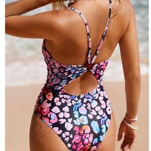 Cupshe vibrant multicolor leopard print one piece swimsuit. It features adjustable straps and a showstopping back complete with O ring design.