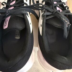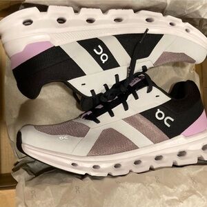 On Cloud cloudrunner sz 9.5 women. Black and lavender/purple color. Only worn a few times. The only “flaw” I could find is a tiny scuff on the left shoe toe front, it’s so small barely photographed BUT I still added a photo for proof. Tread looks great, photos added. I have the original box.