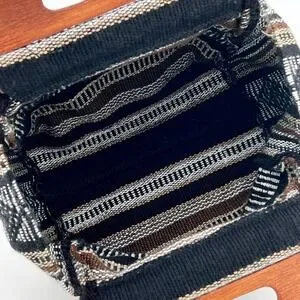 This is a small, darling, double wooden handled, authentic Pinzon, open tote bag, handmade in Mexico, in a black and brown Aztec print. It is in new condition with no flaws or wear. It measures 11" x 8" x 5", so it's big enough to carry your daily essentials for lunch or shopping. I love it as a small needlework/knitting bag. Or as a book bag or magazine bag in a guestroom.