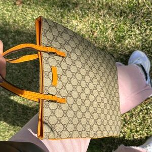 ✅ Elegant Gucci tote with signature pattern. Features orange handles and trim. Ideal for versatile use. ✨