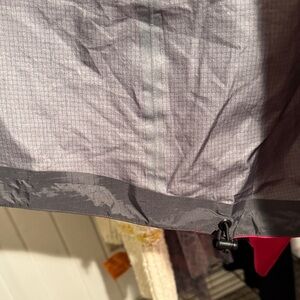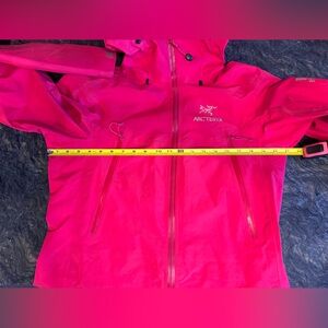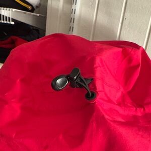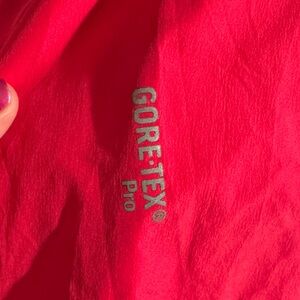 Vibrant red woman’s Lightweight and protective. Ideal shell for skiing or boarding. Hood goes over helmet. To small black mark on the front. Please see pictures