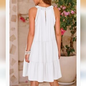 Super cute boho chic white sleeveless dress is fully lined. Crochet top.