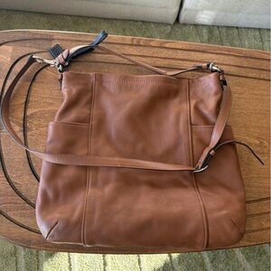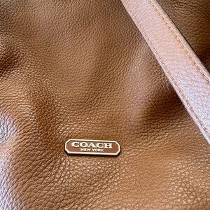 Stylish Coach shoulder bag in tan leather. Features a sleek design with adjustable strap. Ideal for everyday use.
