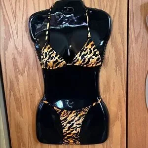 The triangle string bikini top is a vintage size small and the bikini bottom is a vintage size medium.