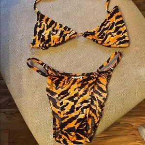 Eye-catching tiger stripe bikini. Bold orange and black pattern. Ideal for sunny beach outings.