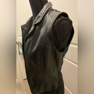 Chic black leather vest by Wilson. Features a soft black leather front with a high quality designed zipper. In back a suede like fabric that has a little stretch which lends to a sexy silhouette