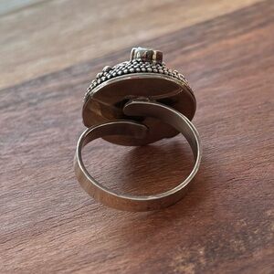 This unique piece features a hand carved white bone moon face design and blue topaz gemstone. This beautiful ring was handmade in Indonesia with 925 Sterling Silver. The band is adjustable it’s already at a larger size 8, can go up or down a couple of sizes. Gently used condition.