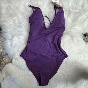Make a statement with this chic purple one piece swimsuit. Ideal for a stylish beach day.