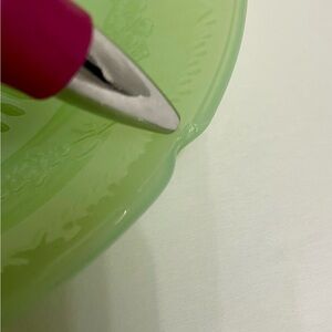 Vintage Anchor Hocking Fire-King Jadeite (jadite) teacup and matching pair of saucers in the classic light green opaque milk glass, dating to the 1940s–1950s Depression/mid-century era. The charming cup features a ribbed, fluted body with delicate raised embossed floral vine or grape cluster motif (clusters of small flowers/leaves on vines) encircling the upper rim for a lovely textured look. The scalloped-edge saucers complement perfectly with a central sunburst/rayed design, concentric ribbing, and the same embossed floral border around the rim—great for mixing and matching in collections. Authentic vintage pieces with that signature translucent glow when held to light; unmarked (common for many jadite items) but clearly Anchor Hocking style. Perfect addition for jadite collectors, farmhouse decor, or everyday vintage charm. Cup measures approx. 2.5” tall; saucers ~5.5–6” diameter. One cup + two saucers included—sold as a coordinating set!