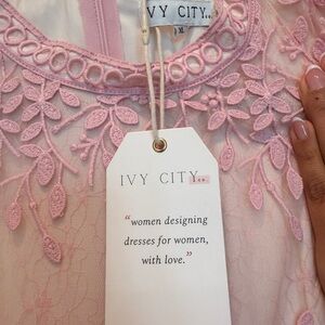 Elegant pink lace midi dress. Features floral embroidery. Short sleeves and round neckline. Perfect for special occasions.