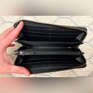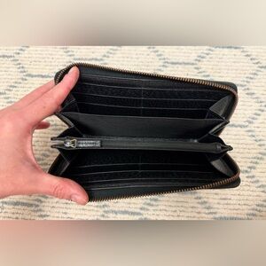 Features: Round zipper closure, multiple card slots, a zippered coin compartment, and bill compartments.