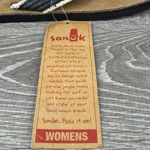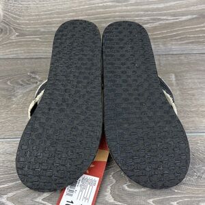 NWT Sanuk Fraidy Cat Women’s Sz 10/EU 41 Black White Tan Slip On Flip Flop Sandals brand new with tags. Stylish black and tan sandals with a comfortable sole. Perfect for casual wear. Get these today ladies.