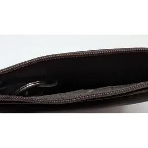 Card wallet zips on top, has a front snap pocket and back open section. The interior has a small keyring inside.