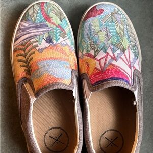 Colorful slip-on sneakers with artistic design. Perfect for casual wear.