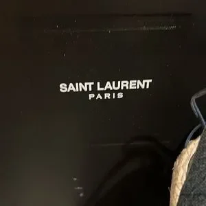 Stylish platform espadrilles by Saint Laurent. Features blue denim upper and tan woven sole. Perfect for casual outings.