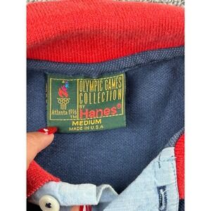 Hanes Shirt in Blue Medium. Features a vintage Atlanta 1996 Olympic Games graphic with a colorblock design. Made of 100% cotton for comfort, this short sleeve polo is perfect for sportswear enthusiasts or collectors.