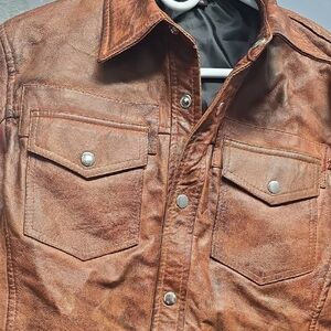 Upgrade your wardrobe with this stylish tan leather shirt jacket. Perfect for layering, it combines comfort and elegance.