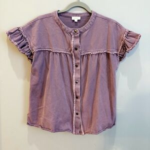Chic purple top with button-up front and ruffle sleeves. Perfect for casual outings.