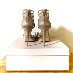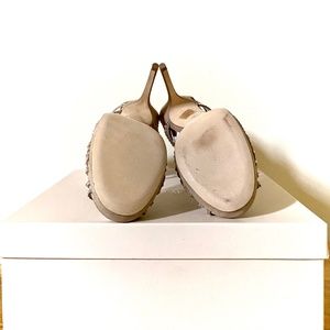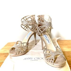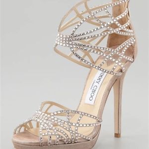 Jimmy Choo Diva multi strap suede crystal cutout stiletto platform sandals come in a soft beige neutral color. Shoes feature a exposed zip closure at the back They include Box and dust bag and are in excellent condition with some faint wear at the bottom. Jimmy Choo runs ~ one size small.