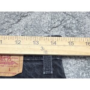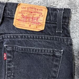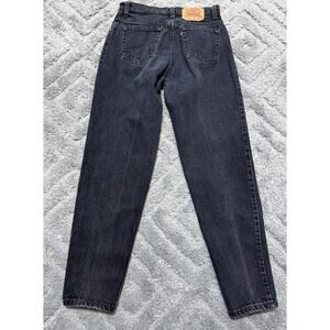 The product is a pair of vintage 90s Levi's 17550-0260 high waist taper jeans in black for women. These jeans are made in the USA from 100% cotton, with a waist size of 29 inches and an inseam of 30 inches. They are original Levi's brand with a regular size type, making them a perfect casual option for those looking for a classic, retro denim look. The black color and high waist style give these jeans a timeless and versatile appeal that can be worn for various occasions.