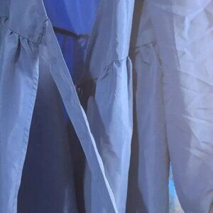New without tags, never worn. Size 38 (size 6 in US) Bright blue wrap dress with inside and outside tie. 27 inches wide at the waist (can be looser with the ties) and approx. 40 inches long. I did not notice any stains.