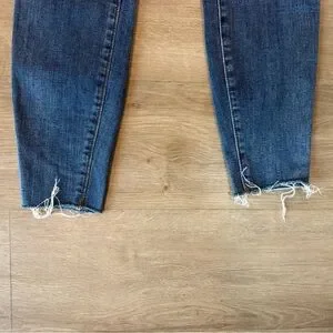 High-rise fit with built-in Fab Ab smoothing panel. Medium wash stretch denim with raw hem (frayed ankle). Flattering skinny silhouette and super comfortable.