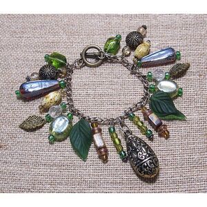 Bohemian charm bracelet. Forest-inspired charms & high-quality beads. Frosted green glass leaves, antiqued brass charms, moss green, amber, & cream beads. Sturdy silver-tone chain, antiqued brass clasp. This stunning, one-of-a-kind handmade charm bracelet features a rich "Forest Core" aesthetic. Perfect for nature lovers or anyone who loves a bohemian look!