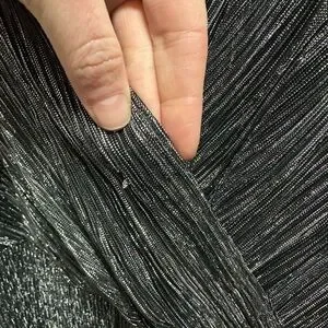 Chic metallic jumpsuit with wrap design. Long sheer sleeves for elegant style. Perfect for evening events. Minor pull at front as seen in photos