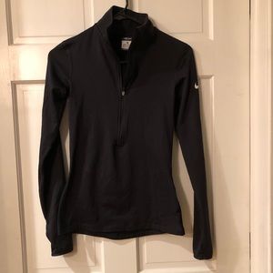 Stylish black Nike sweatshirt. Features a half-zip design. Comfortable and versatile.