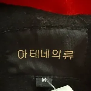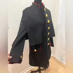 Sophisticated black cape with striking gold buttons. Red trim adds a pop of color. Perfect for stylish layering.