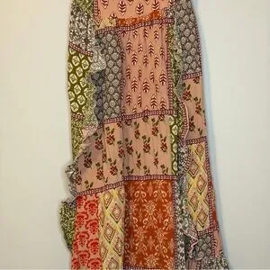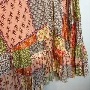 Embrace elegance with this floral patchwork maxi dress. Featuring a delightful blend of pink, green, and orange, it's perfect for any occasion.