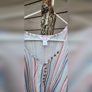 Stylish blouse with multicolor stripes. Features button accents and a relaxed fit. Perfect for casual wear.