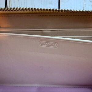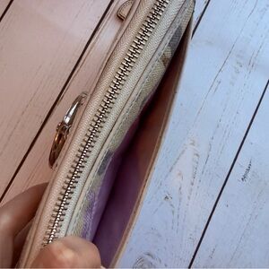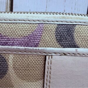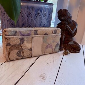Coach Soho Optic Linen zip around long wallet in cream and purple. Hardware is in excellent condition. Does have minor corner wear. Please review photos carefully.