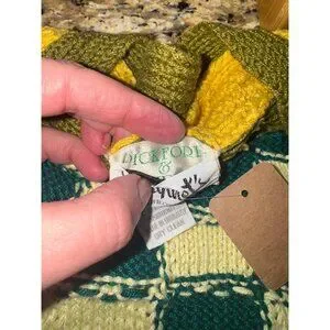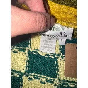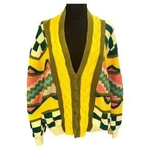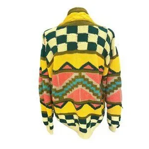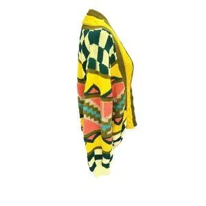 This handknit cardigan combines vibrant geometric patterns with a bold color palette. Crafted from cotton for comfort, it features a button-up front and cable detailing. There are two brand tags.