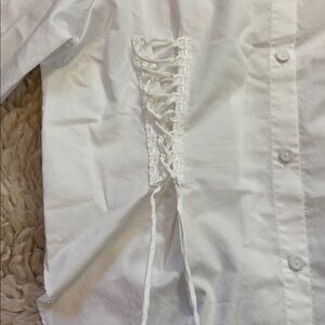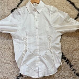 Elegant white button-up shirt with lace-up details. Perfect for a chic look. Amazing shirt in amazing condition. Look at those laces. Look at those sleeves. For fans of Rudy Jude, Doen, sezane, babaa, cordera, Christy Dawn