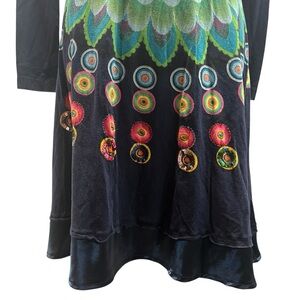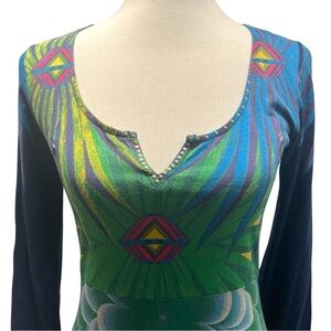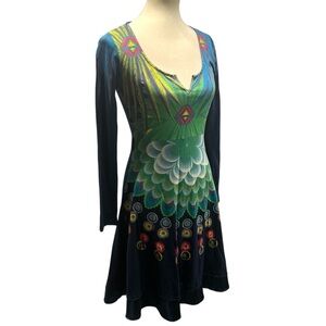 Desigual Blue Print Cotton Blend Long Sleeve Split Neck Boho Dress Women Medium