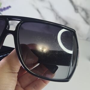 Givenchy sun-glasses unisex oversized squarish frame black lenses with a bend to the outer sides, trendy design clear frame with large tonal clear plastic arms and double front bridge, large tonal Givenchy brand logo embossed to both outer arms.