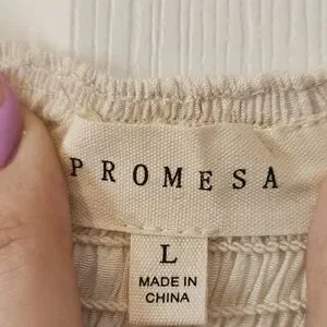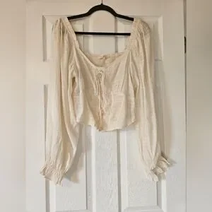Elegant cream blouse with lace-up front. Features long sleeves and square neckline. Perfect for casual or dressy occasions.