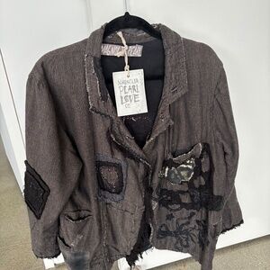 One size - cotton yarn patchwork, distressing, mixed buttons snaps- perfect condition - raw edge fringing, 26 inches long - 44 inch bust - menswear striped lining