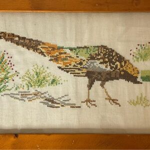 Vintage Beautifully framed handcrafted pheasant bird embroidery art featuring a vibrant mix of colors. Perfect for adding a touch of nature to your home decor. 28 x15