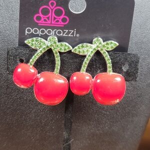 Vibrant red cherries with shimmering green leaves. Adds a playful touch.