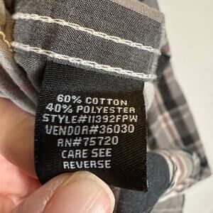 Features: Long sleeves, western style, pearl like snaps, cotton blend, easy care, collared, chest pockets, relaxed fit, lightweight.