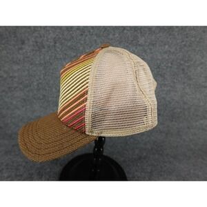 Prana Trucker Hat Womens OS Brown Good. This stylish cap features a unique chevron embroidered front panel with vibrant stripes in sunset hues. Designed with a breathable mesh back and a classic snapback closure, it offers both comfort and a customizable fit. The brim and front are crafted from a durable jute blend, giving it a natural, earthy texture perfect for outdoor adventures or casual wear.