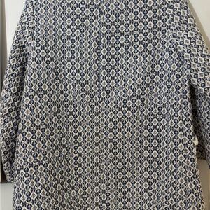 Beautiful weighted blazer with intricate blue and white design. Features a tailored fit and elegant trim. Perfect for elevating any look.