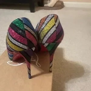 Dazzle with these Christian Louboutin heels. Glittery multicolor stripes. Iconic red sole for a luxurious touch.