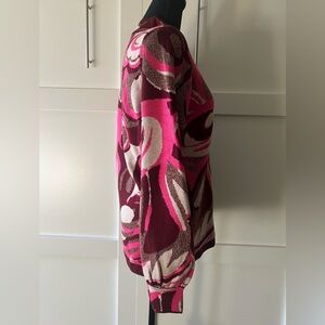 Stunning and comfortable mock neck with a 70s vibe. Beautiful pink, burgundy, metallic gold, and cream swirl pattern. Worn once, excellent like-new condition.