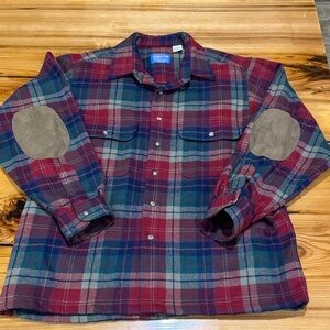 Classic Pendleton wool shirt with a multicolor plaid pattern and leather elbow patches. Crafted from pure virgin wool. Pit to pit 25in, top of shoulder to bottom hem 31in. This is in excellent condition.