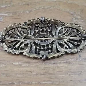 This elegant brooch features a stunning combination of brownish and gold tones, perfect for adding a touch of sophistication to any outfit. 3" long