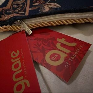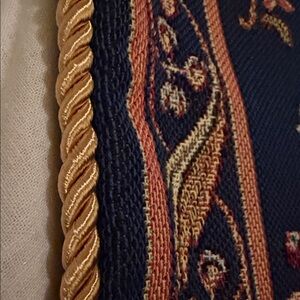 The detailed squirrel and floral design is woven ā not printed ā giving it depth, texture, and heirloom-quality character. Finished with a refined gold twisted cord trim and concealed zipper closure, this piece feels both classic and collected.